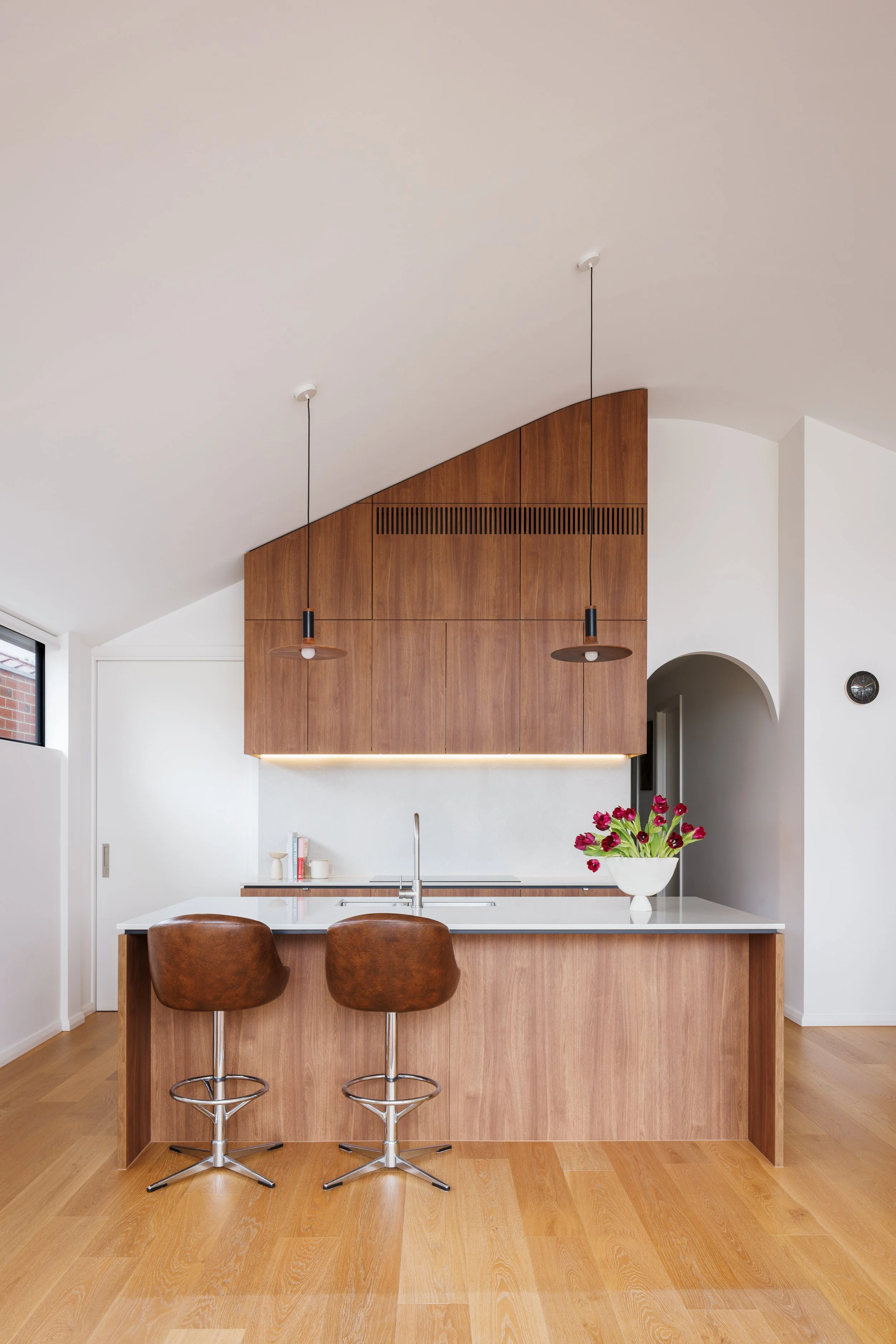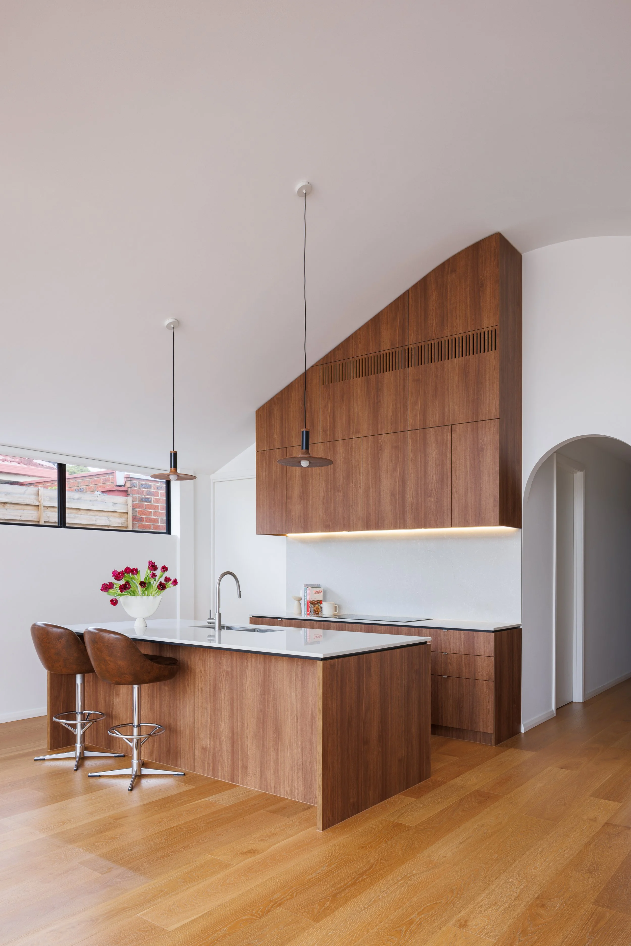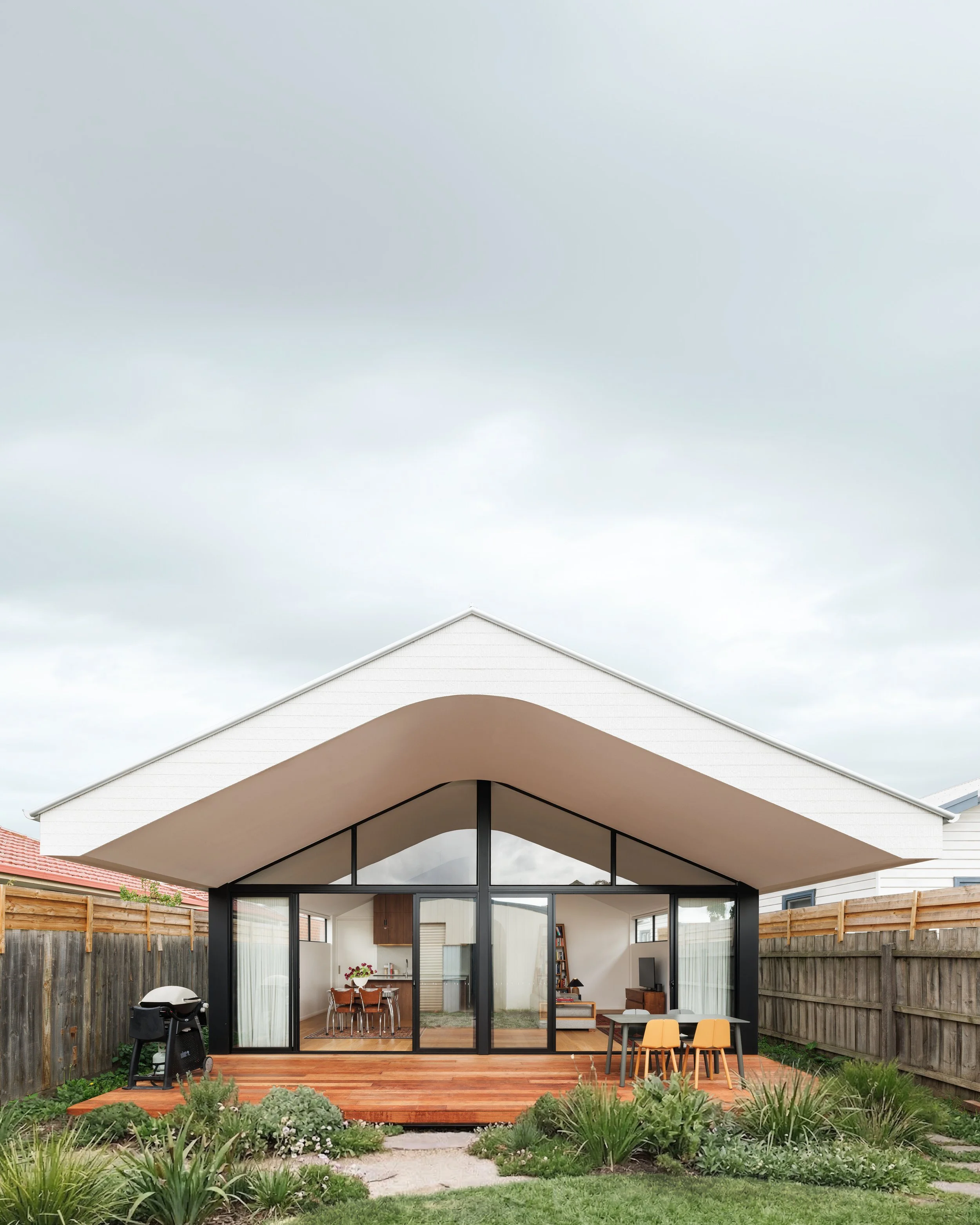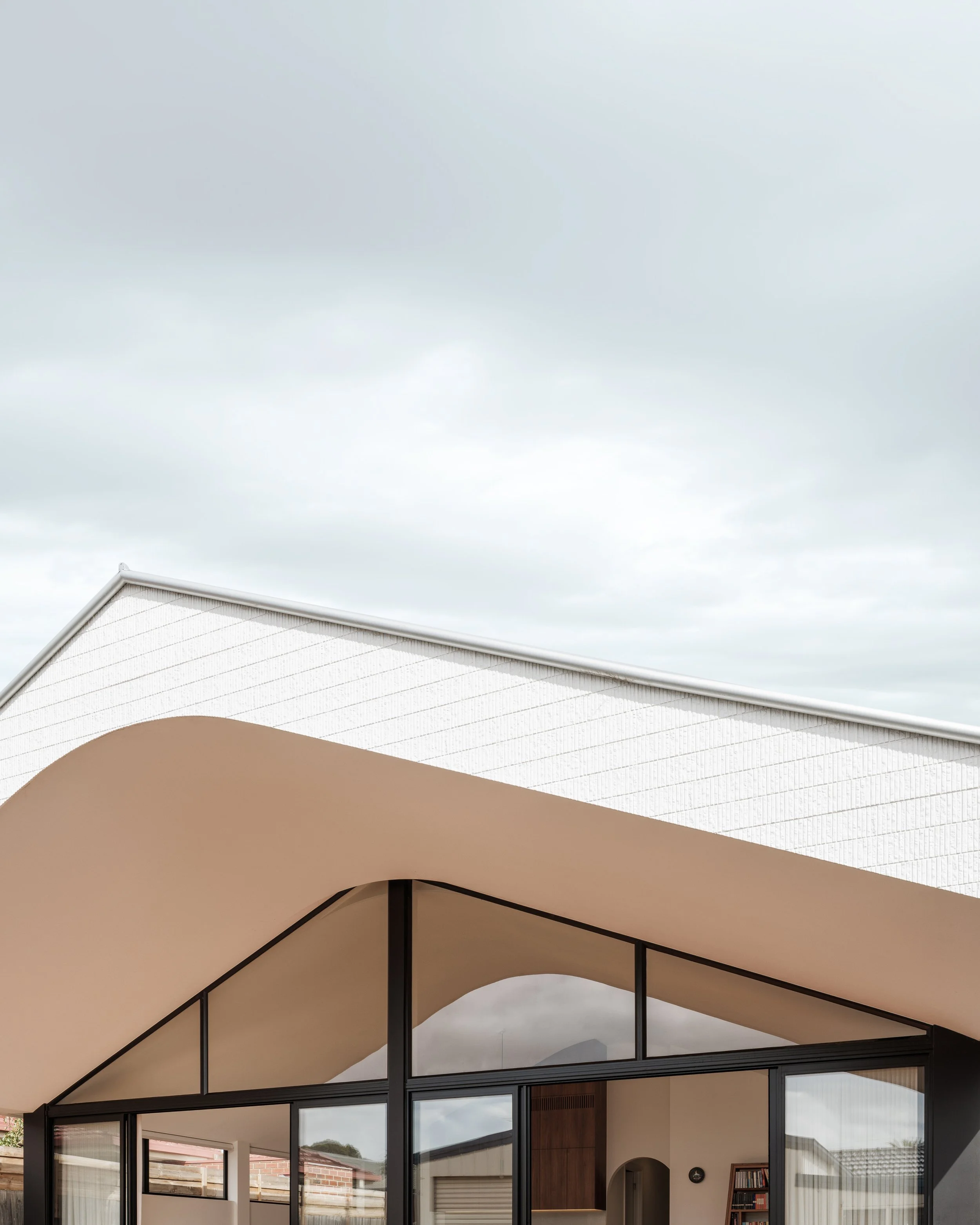 This renovation is defined by a single, sculptural curved roof that extends the original roofline into something bold yet quietly expressive. A generous gabled window frames the sky, drawing light deep into the home and visually extending the living space into the garden beyond.