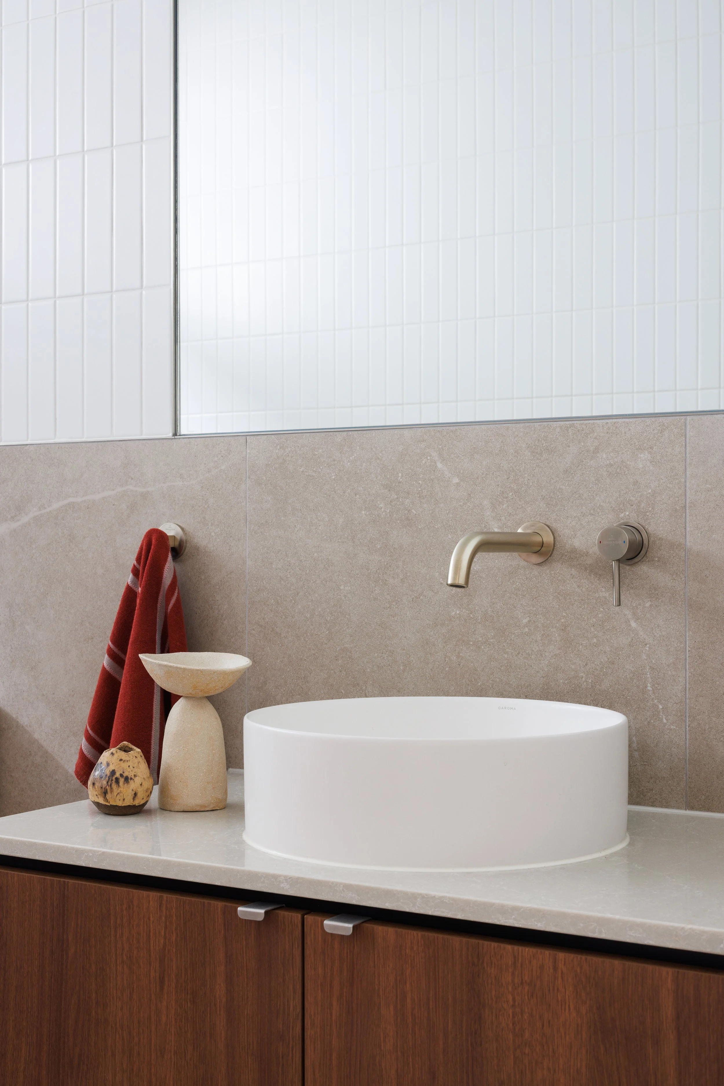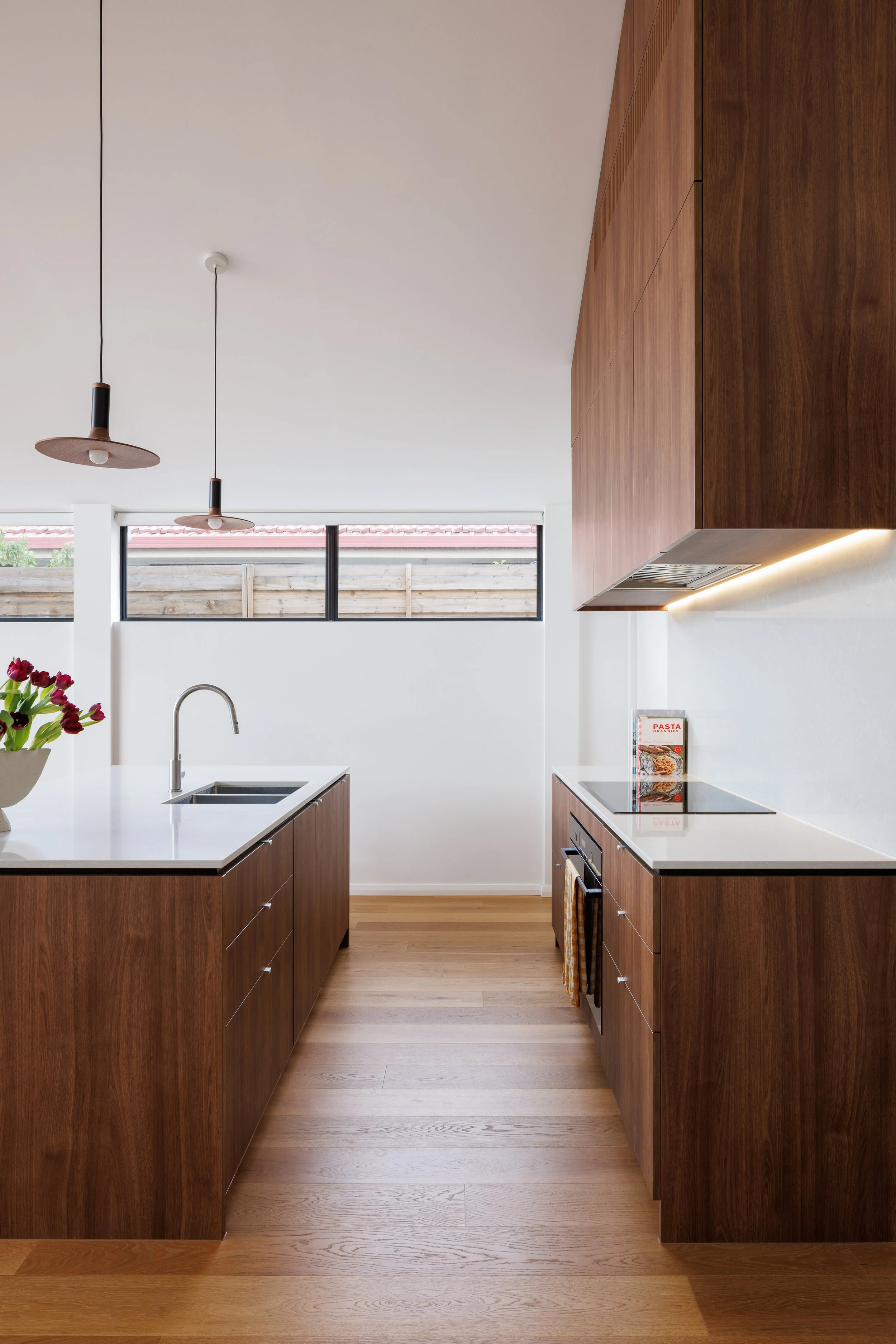 Functionally, the kitchen balances clarity with performance. Behind a concealed sliding door, the pantry, fridge, appliances, and coffee station are neatly organised—keeping the visible space minimal while ensuring everything remains within easy reach. It’s a considered approach that allows for both a clean aesthetic and a highly functional family kitchen.