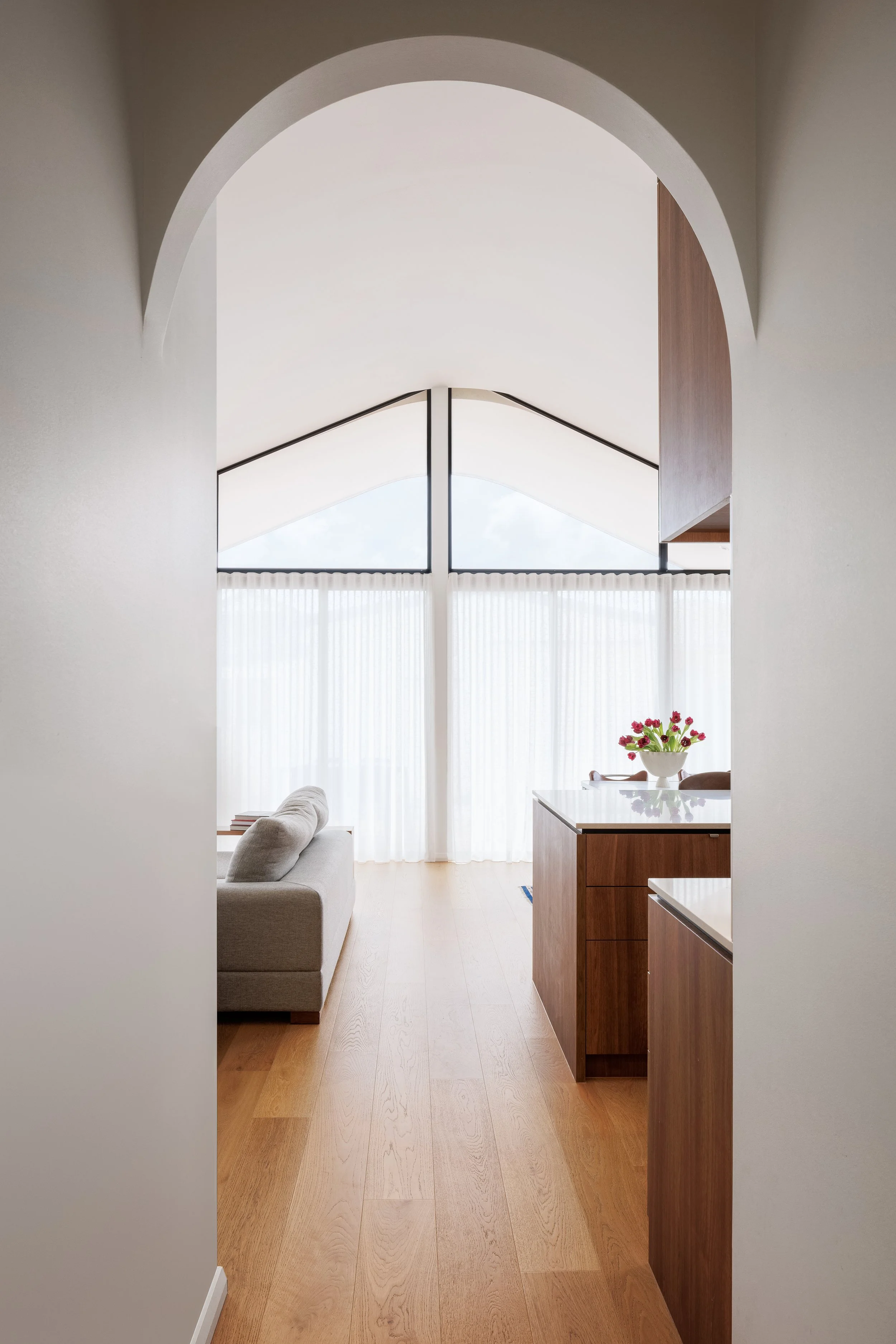 Family life is inherently dynamic. Without moments of stillness, even the home can feel overwhelming. A restrained material palette and soft architectural geometry work together to bring a sense of calm—arched thresholds and a vaulted ceiling forming a cohesive backdrop that supports, rather than competes with, everyday life.